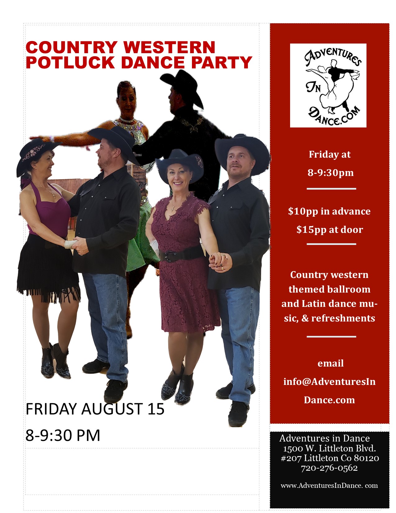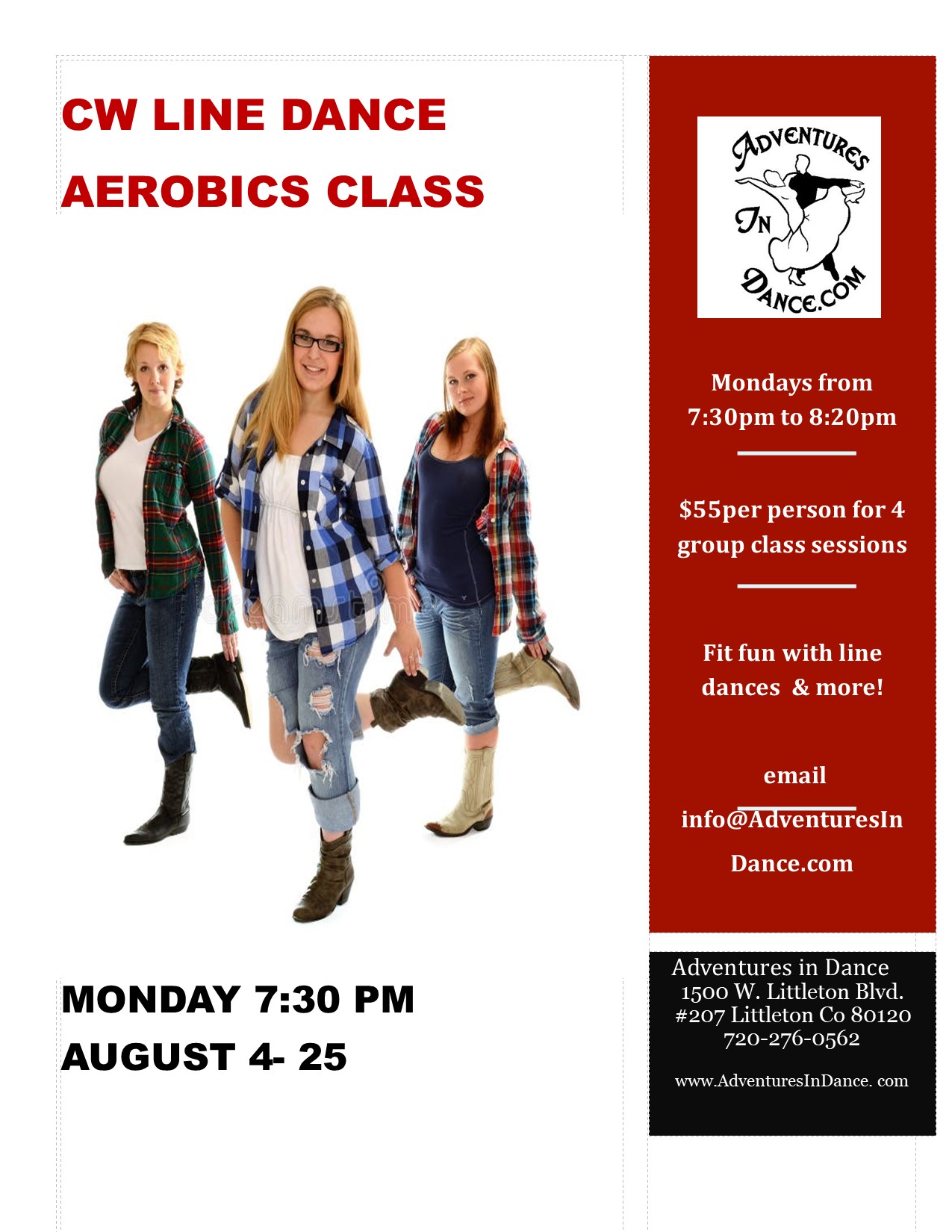 July/August Cowboy Cha-Cha Dance Class Tuesdays from 7-7:50pm $100 per person for 8 group class sessions. Beginner & intermediate dancers have fun learning Cha-Cha found at Colorado salsa dance clubs. July 1st -August 19th $100 per person for 8 group class sessions! $15 per person per session drop in.