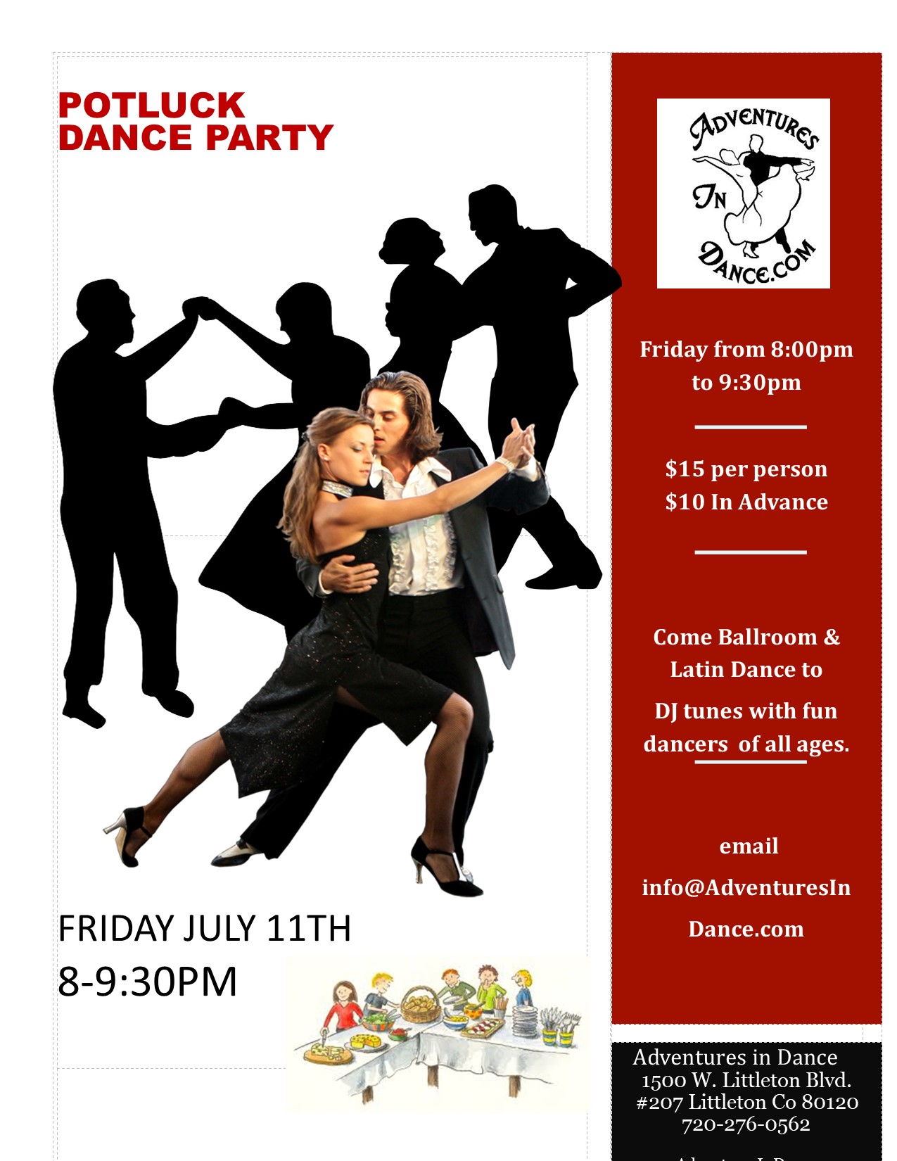 ![]() July 11th Potluck Ballroom & Latin Dance Party 8-9:30 pm Join your friends at Adventures in dance for a fun evening of ballroom, Latin, salsa, swing and tango dancing! Dress to impress in your best! Food, Friends & Fun! Club Admission $10 per person in advance, $15 at the door space permitting Reservations Encouraged.