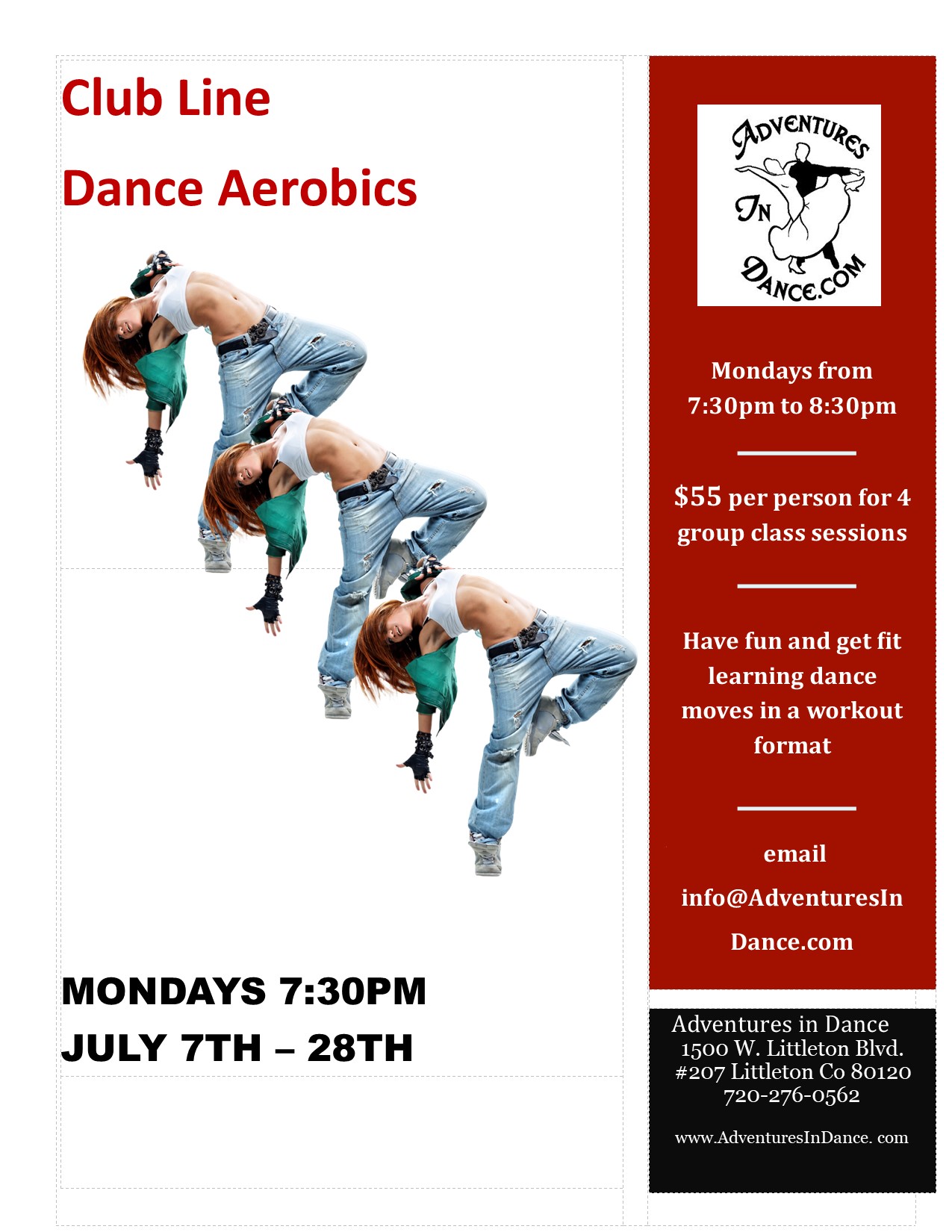![]() July Club Line Dance Aerobics Class Mondays from 7:30-8:30pm July 7th-28th $55 per person for 4 group class sessions Feel the burn as you dance fun line dance moves! $15 per person per session drop in.