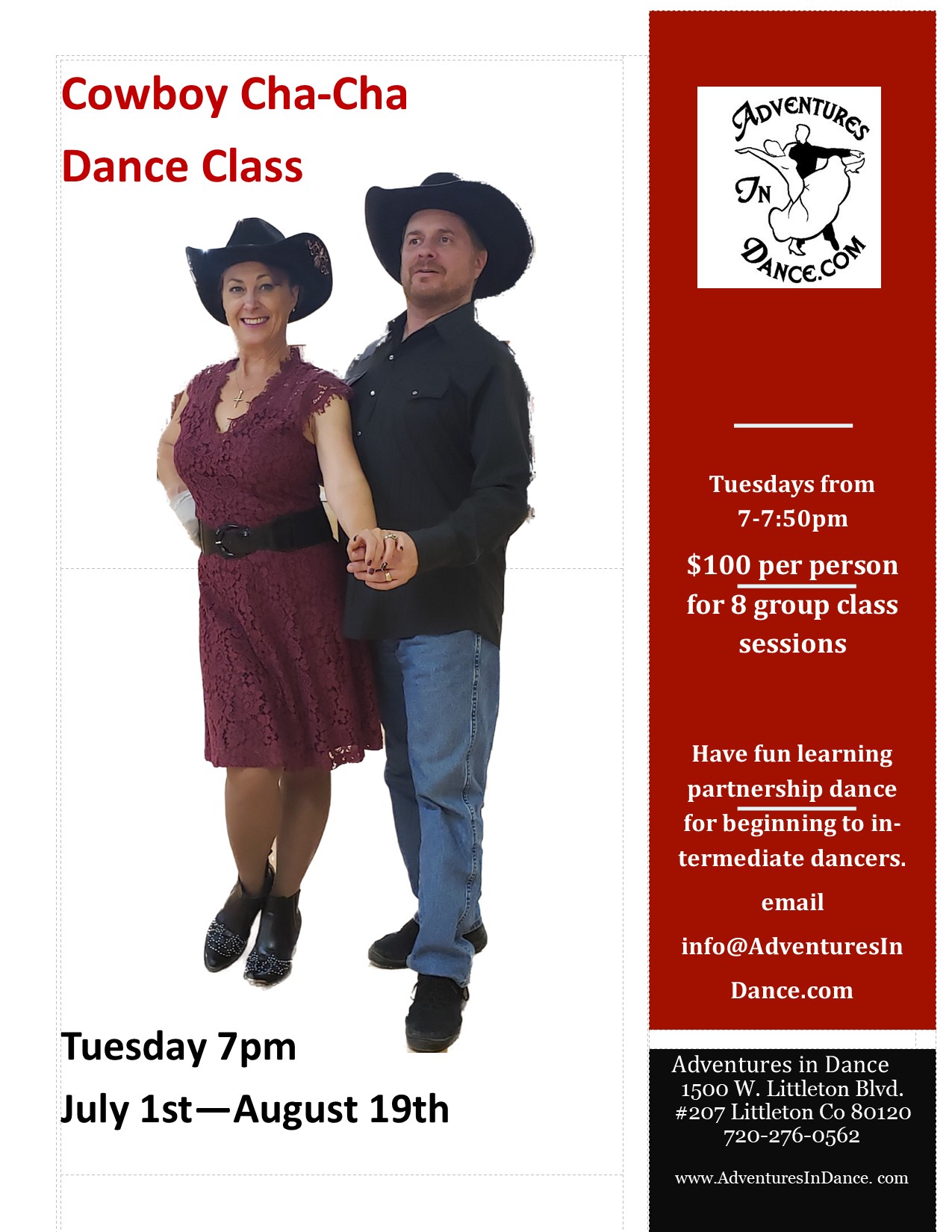 ![]() July/August Cowboy Cha-Cha Dance Class Tuesdays from 7-7:50pm $100 per person for 8 group class sessions. Beginner & intermediate dancers have fun learning Cha-Cha found at Colorado salsa dance clubs. July 1st -August 19th $100 per person for 8 group class sessions! $15 per person per session drop in.
