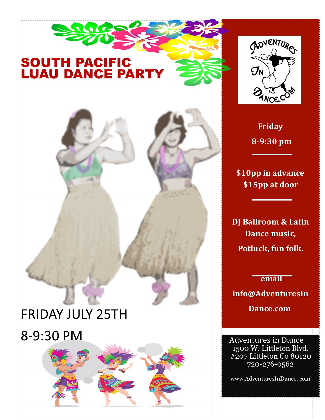![]() July 25th Potluck Ballroom & Latin South Pacific Luau Dance Party 8-9:30 pm Join your friends at Adventures in dance for a fun evening of ballroom, Latin, salsa, swing and tango dancing! Dress to impress in your best! Food, Friends & Fun! Club Admission $10 per person in advance, $15 at the door space permitting[...]
