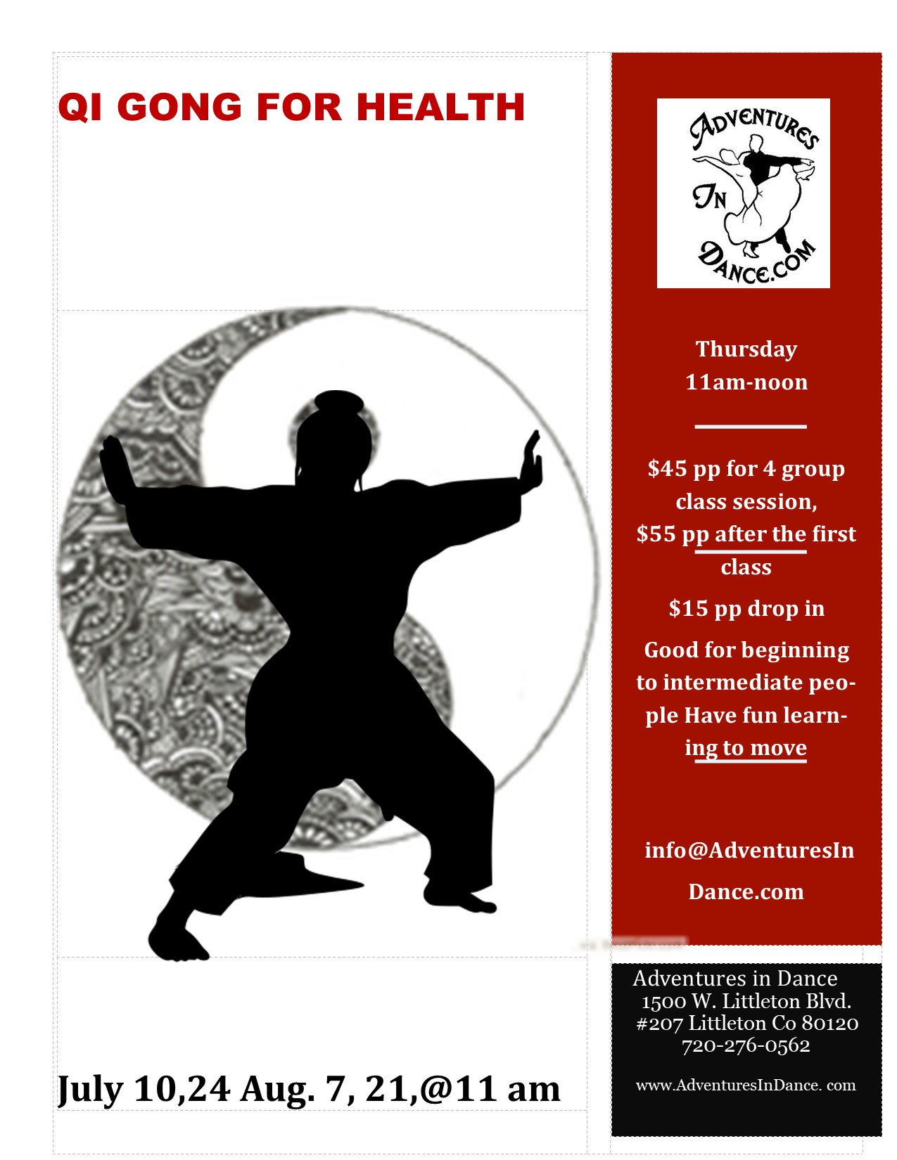 ![]() Qi Gong for Health Thursday, July 10,24 Aug. 7, 21, 11 am-noon 2025 Good for beginning to intermediate people Have fun learning to healing Qi Gong. $55 for 4 group class sessions. $15pp for a drop in group class session. https://www.adventuresindance.com/product/july-august-qi-gong-for-health-copy/