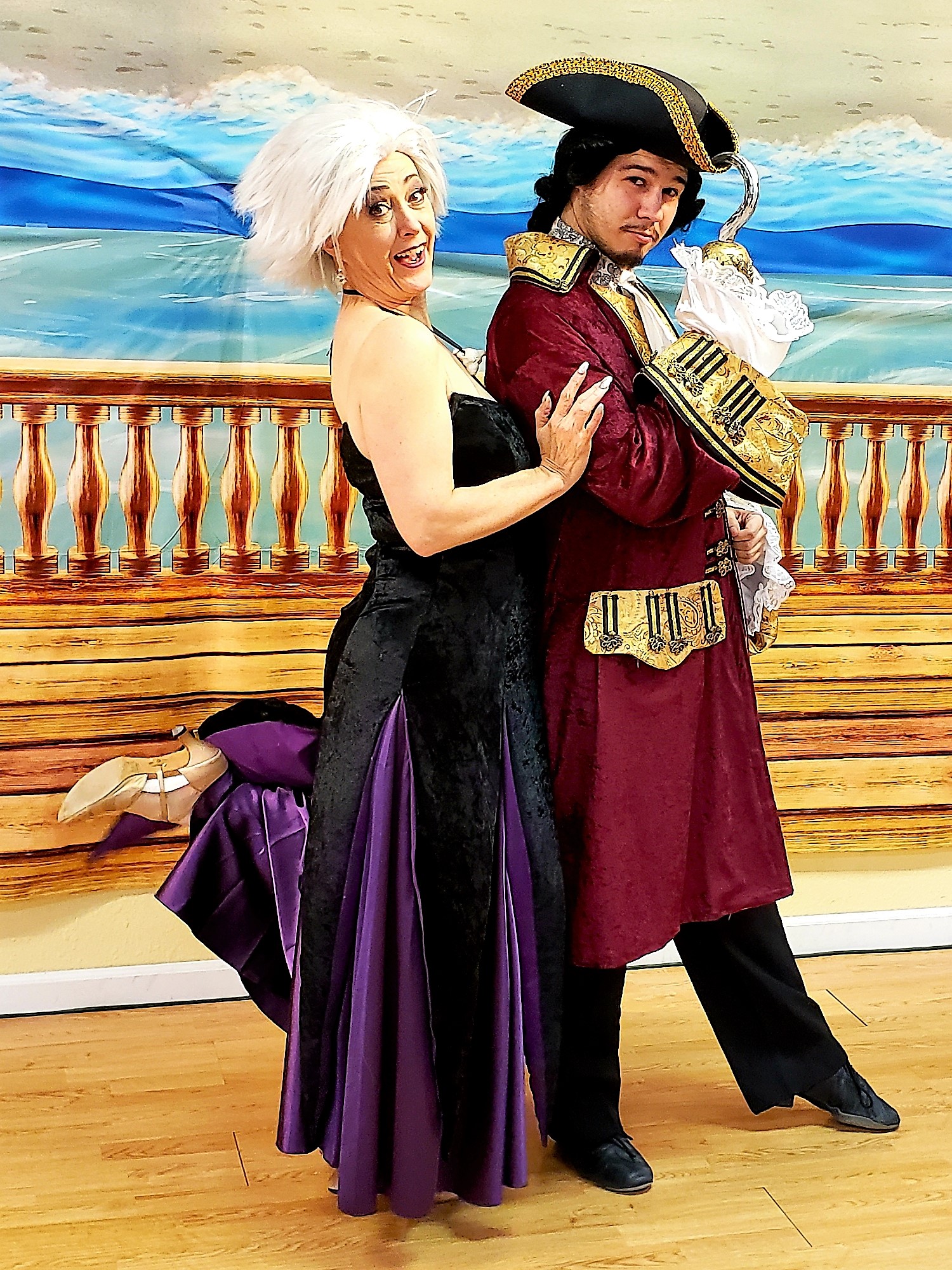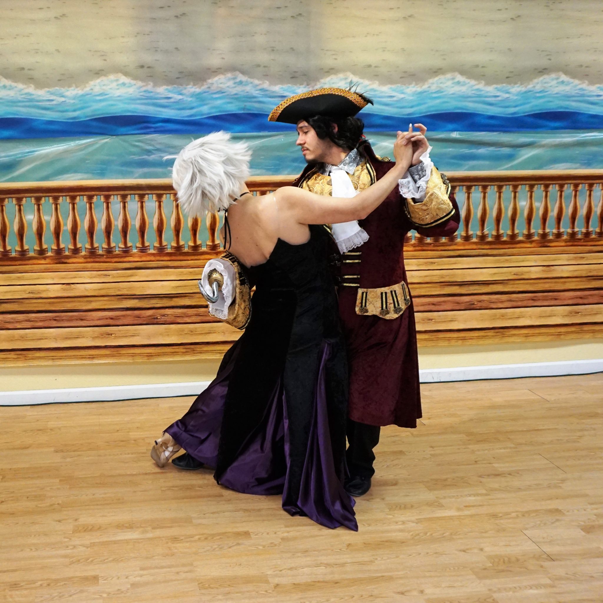Goddess of the sea Ursula makes a deal to join Hook for a spin around the deck. Sister to Triton and daughter of the god Poseidon, the Sea Witch is an artful negotiator and has the perfect hook for our Captain. We took a turn with the Victorian French Pirouette waltz (link) for our lovely Cephalopod.