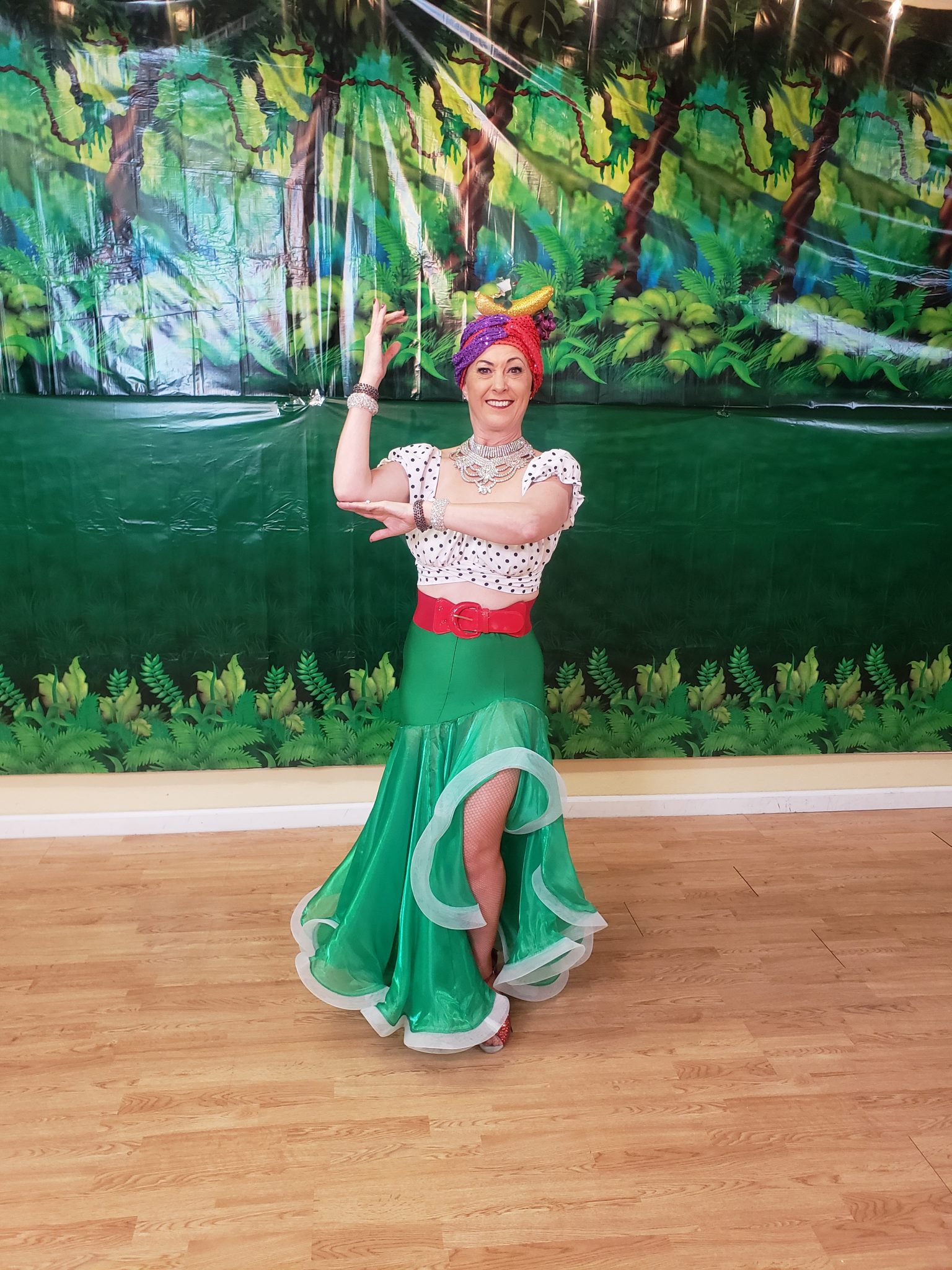 Exploding onto the big screen with Chicca Chicca Boom Chick, Carmen opened the film “That Night in Rio.” This was an over-the-top war time Fox musical featuring big cast, elaborate costumes, and exotic musical numbers. The opening number Chicca Chicca Boom Chick is the inspiration for my Carmen Miranda Chicca Chicca Boom Chick Samba Line Dance How To.