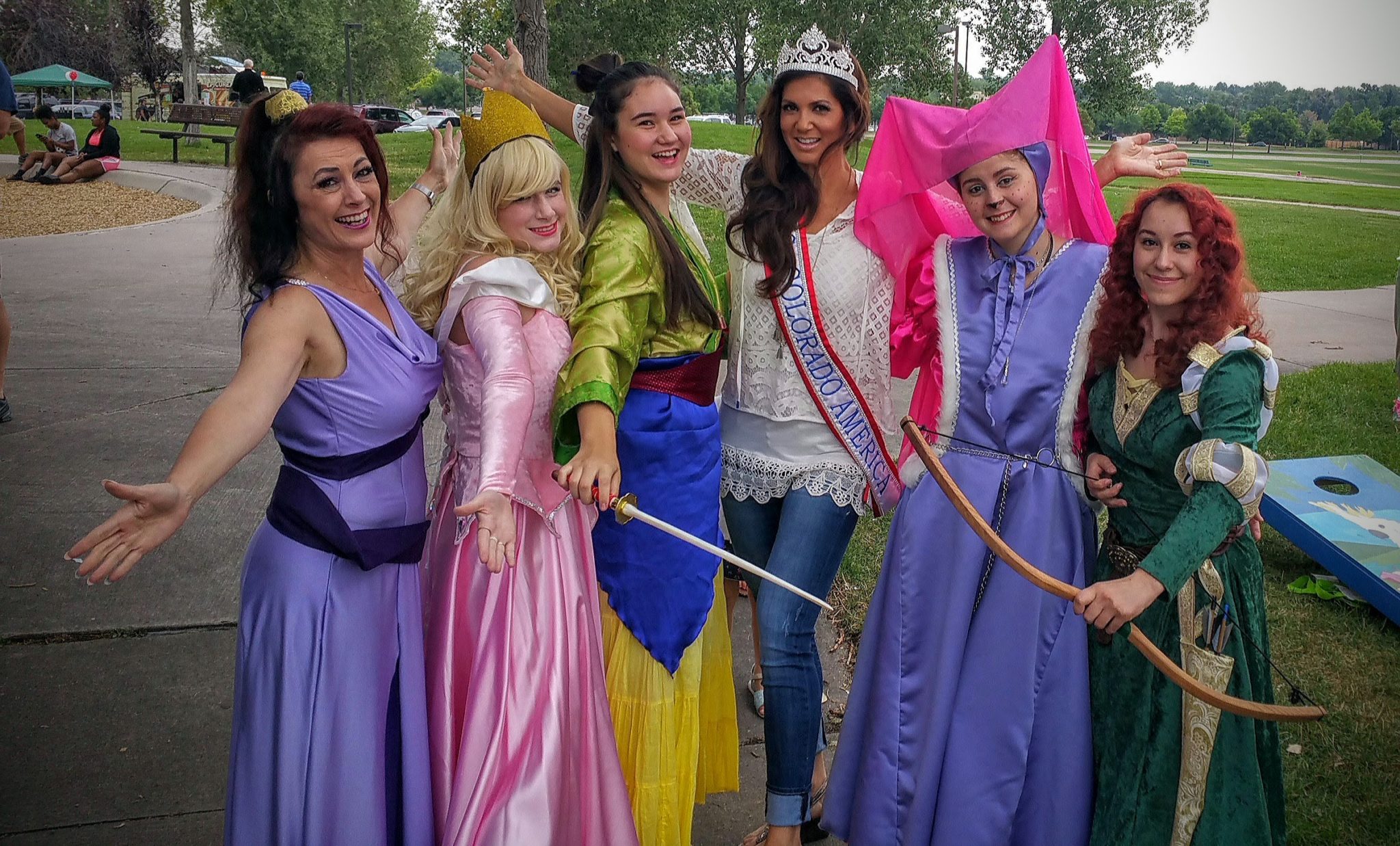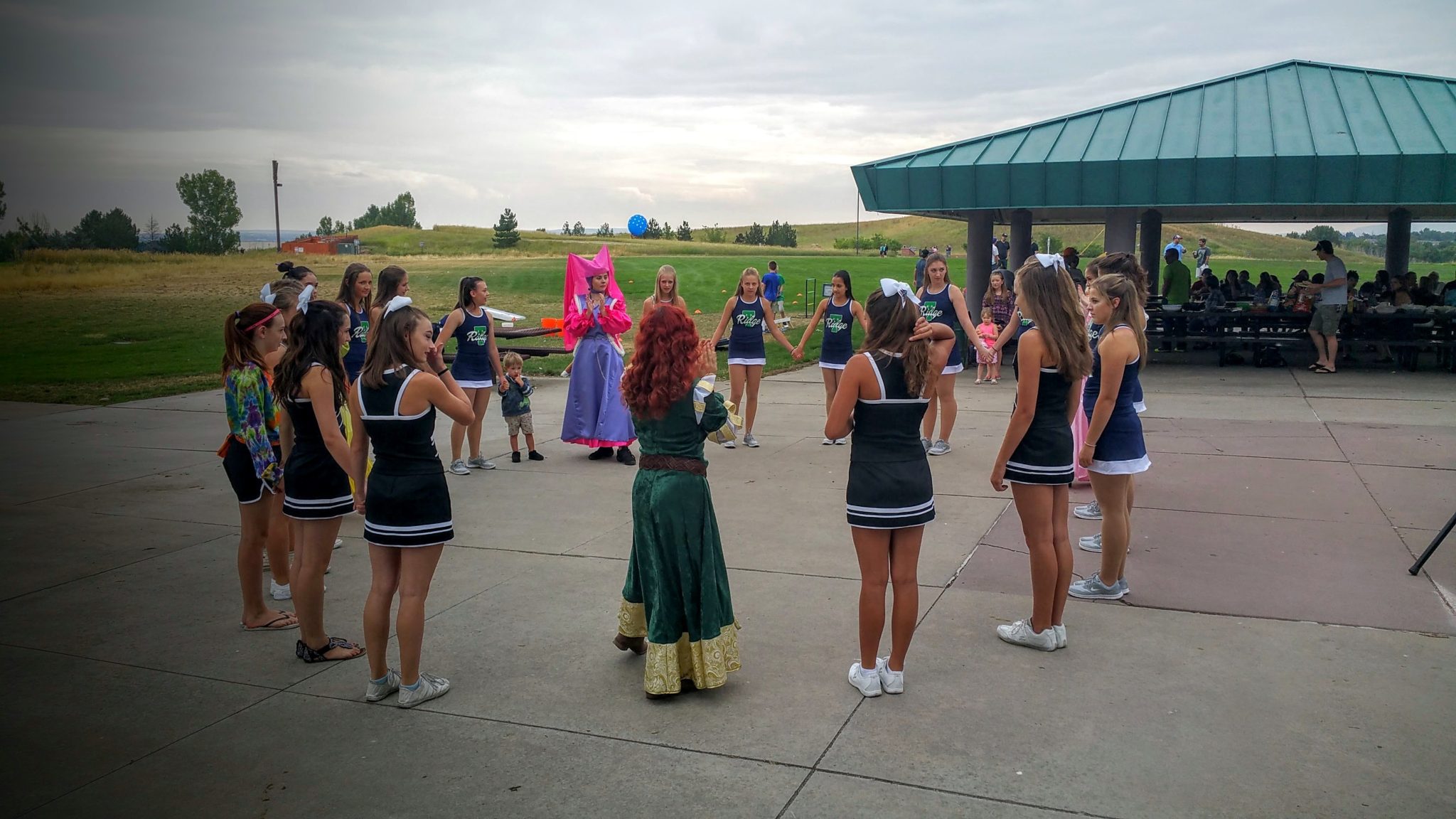 On Saturday, August 6, the historically accurate Dancing Princesses turned out at the park. They included Megara from Hercules (Holly), Merida from Brave (Robyn), Maid Marian from Robin Hood (Julie), Mulan (Sabrina), and Aurora from Sleeping Beauty (Rachel). They took pictures with celebrities and children. After demonstrating a medieval court dance, they gathered the Chatfield High school Cheer Team and the Thunder Ridge High School dance team and taught them a couple of fun Medieval dances, like the Turkish Brawl, Toss the Duchess, and Strip the Willow.